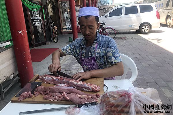 2018年8月14日,固原縣一位村民在自家店鋪外仔細地切著自家養殖的黃牛肉。(中國臺灣網 黃曉迪 攝)