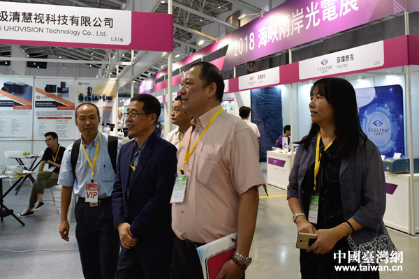 高偉副主任(左2)在光電協進會及商務部貿發局相關人員陪同下參觀海峽兩岸光電展區。(中國臺灣網發 機電商會臺北辦事處供圖)