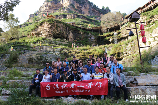 臺灣媒體人在懸空村下的合影。(中國臺灣網 袁楚 攝)
