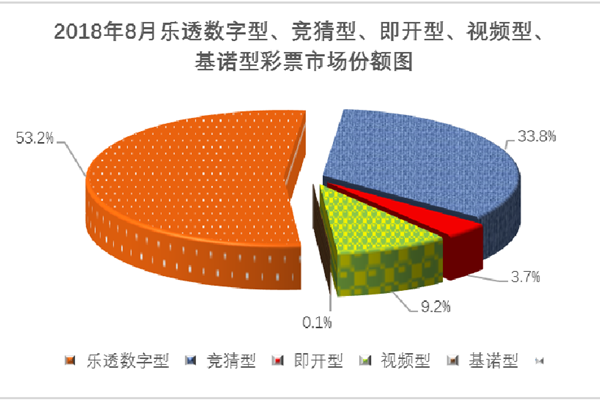1-8月累計,樂透數字型彩票銷售1827.65億元,同比增加118.92億元,增長7.0%;競猜型彩票銷售1129.60億元,同比增加572.06億元,增長102.6%;即開型彩票銷售146.64億元,同比減少17.30億元,下降10.6%;視頻型彩票銷售311.77億元,同比增加4.76億元,增長1.5%;基諾型彩票銷售0.89億元,同比減少0.40億元,下降31.3%。1月至8月份樂透數字型、競猜型、即開型、視頻型和基諾型彩票銷售量分別佔彩票銷售總量的53.5%、33.0%、4.3%、9.1%、0.1%。