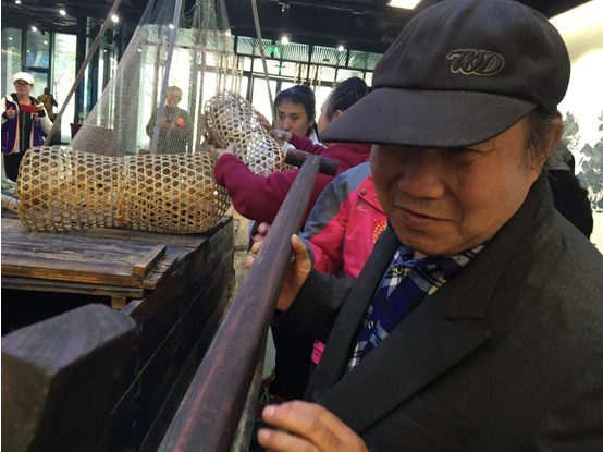 圖為盲人朋友觸摸白洋淀漁民打魚工具