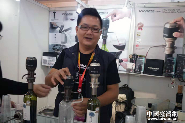 參展商鐘葉儀來自臺北,他自主研發、全球首創的Vinaera Pro電子醒酒器于2014年推出後,就相繼獲得2014德國紅點設計至尊大獎、2017日本(G-MARK)優良設計獎、2017臺灣金點設計獎、2017倫敦國際創意競賽獎、2017美國IDA設計金獎、2018比利時歐洲設計銀獎。(中國臺灣網 王怡然 攝)