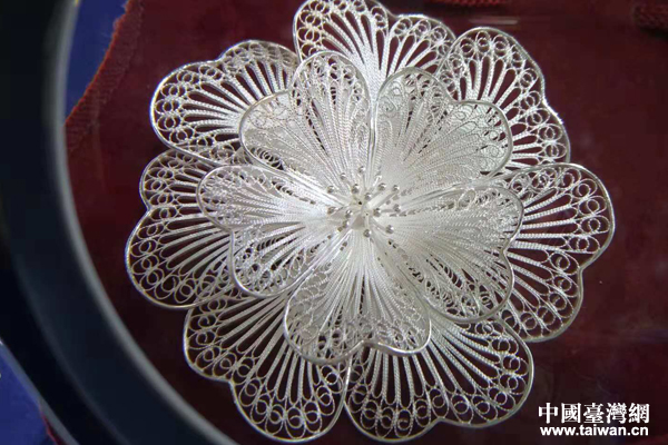 郭誠壽和劉慈悲是一對來自新北的老夫婦,他們帶來參展的作品是掐絲銀飾。掐絲是古代金工傳統工藝之一,此項工藝多在寶石、金銀飾、琺瑯器上運用。在這對老夫妻的展臺前,記者看到,在明亮的熒光燈管照射下,一件件做工精細的銀飾雪白閃亮。