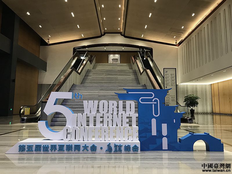 烏鎮互聯網國際會展中心的第五屆世界互聯網大會LOGO。(中國臺灣網 張亞靜 攝)
