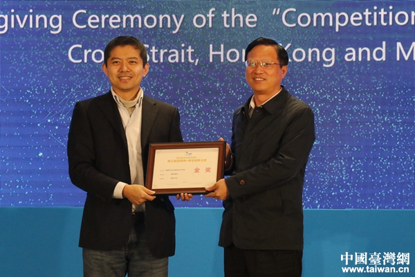 海峽兩岸暨香港、澳門互聯網+青年創客大賽臺灣金獎獲獎者上臺領獎。(中國臺灣網 張亞靜 攝)