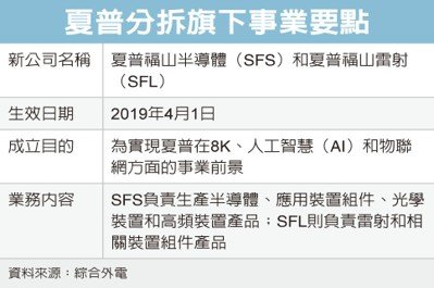 新成立的子公司,其一為“夏普福山半導體”,主要業務為半導體、應用裝置與模塊事業、光學裝置等;另一家為“夏普福山雷射”,主要業務為雷射及其應用裝置模塊,此案將在2019年4月1日生效。