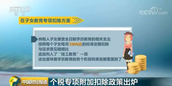 在子女教育專項扣除方面,納稅人子女接受全日制學歷教育的相關支出,按照每個子女每月1000元的標準定額扣除,與徵求意見稿相比,追加列入了“技工教育”一項,這也意味著學歷教育的各個階段和類型都覆蓋到了。