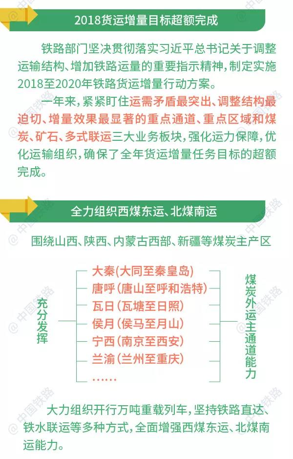 中國鐵路總公司有關部門負責人介紹,鐵路部門堅決貫徹落實習近平總書記關于調整運輸結構、增加鐵路運量的重要指示精神,制定實施2018至2020年鐵路貨運增量行動方案。一年來,緊緊盯住運需矛盾最突出、調整結構最迫切、增量效果最顯著的重點通道、重點區域和煤炭、礦石、多式聯運三大業務板塊,強化運力保障,優化運輸組織,確保了全年貨運增量任務目標的超額完成。