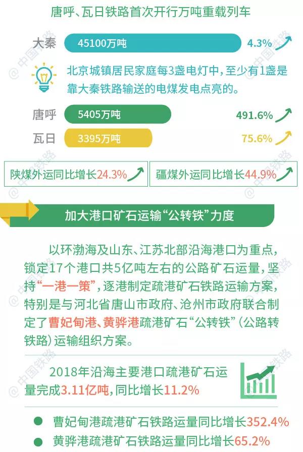 圍繞山西、陜西、內蒙西部、新疆等煤炭主產區,充分發揮大秦(大同至秦皇島)、唐呼(唐山至呼和浩特)、瓦日(瓦塘至日照)、侯月(侯馬至月山)、寧西(南京至西安)、蘭渝(蘭州至重慶)等煤炭外運主通道能力,大力組織開行萬噸重載列車,堅持鐵路直達、鐵水聯運等多種方式,全面增強西煤東運、北煤南運能力。2018年以來,唐呼、瓦日鐵路首次開行萬噸重載列車,大秦、唐呼、瓦日鐵路全年運量分別完成45100、5405、3395萬噸,同比增長4.3%、491.6%、75.6%,陜煤外運和疆煤外運分別同比增長24.3%、44.9%。