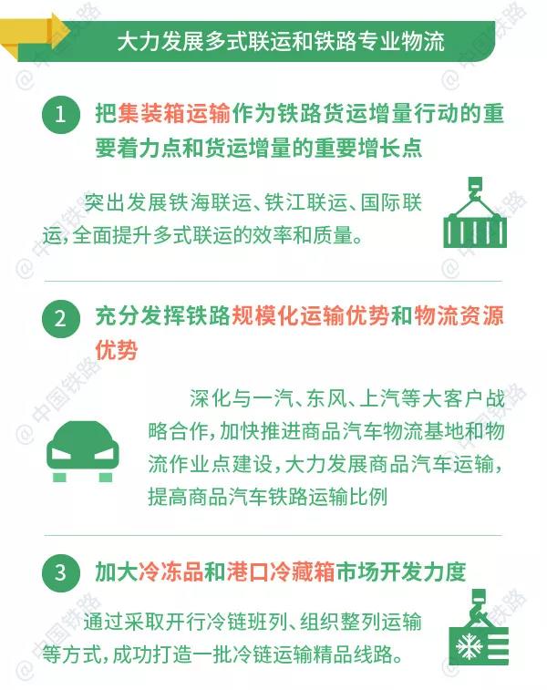 把集裝箱運輸作為鐵路貨運增量行動的重要著力點和貨運增量的重要增長點,突出發展鐵海聯運、鐵江聯運、國際聯運,全面提升多式聯運的效率和質量。充分發揮鐵路規模化運輸優勢和物流資源優勢,深化與一汽、東風、上汽等大客戶戰略合作,加快推進商品汽車物流基地和物流作業點建設,大力發展商品汽車運輸,提高商品汽車鐵路運輸比例。加大冷凍品和港口冷藏箱市場開發,通過採取開行冷鏈班列、組織整列運輸等方式,成功打造一批冷鏈運輸精品線路。2018年,鐵路集裝箱、商品汽車、冷鏈運輸分別同比增長33.4%、25.1%、52.3%。