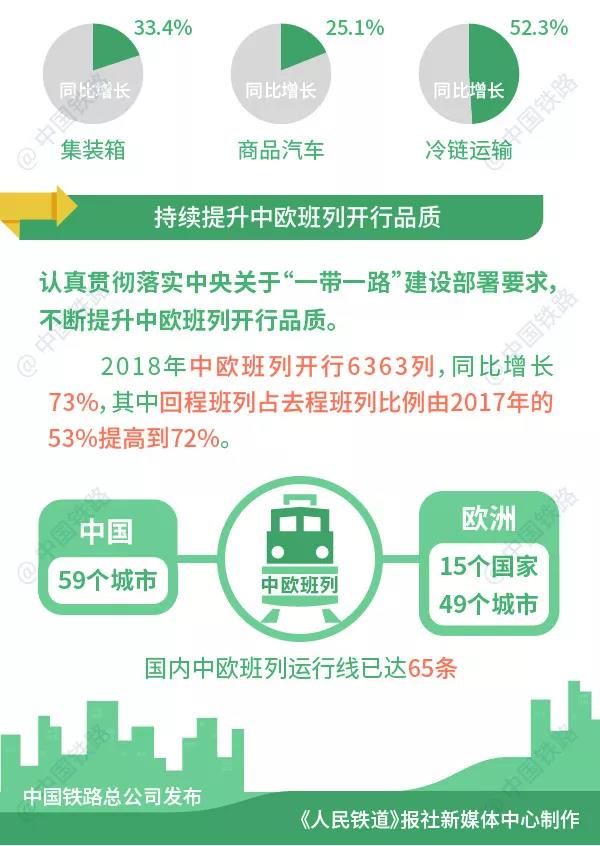認真貫徹落實中央關于“一帶一路”建設部署要求,不斷提升中歐班列開行品質。2018年中歐班列開行6363列,同比增長73%,其中回程班列佔去程班列比例由2017年的53%提高到72%,雙向運輸進一步趨向均衡。目前,國內已有59個城市與歐洲15個國家49個城市間開通了中歐班列,國內中歐班列運行線已達65條。(完)
