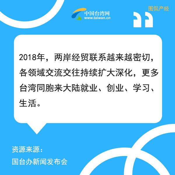 編者按:1月16日,國臺辦舉行2019年第一場新聞發布會。新聞發言人馬曉光應記者要求,首先簡要介紹了2018年兩岸關係發展和對臺工作的情況。馬曉光介紹,兩岸經貿聯係越來越密切,各領域交流交往持續擴大深化,更多臺灣同胞來大陸就業、創業、學習、生活。