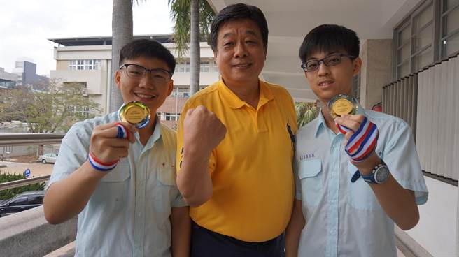 臺中一中學生陳柏融(左)、陳勇安(右)奪下“臺灣國際科學展覽會”一等獎,開心與校長陳木柱(中)合影。(圖片來源:臺灣“中時電子報”)