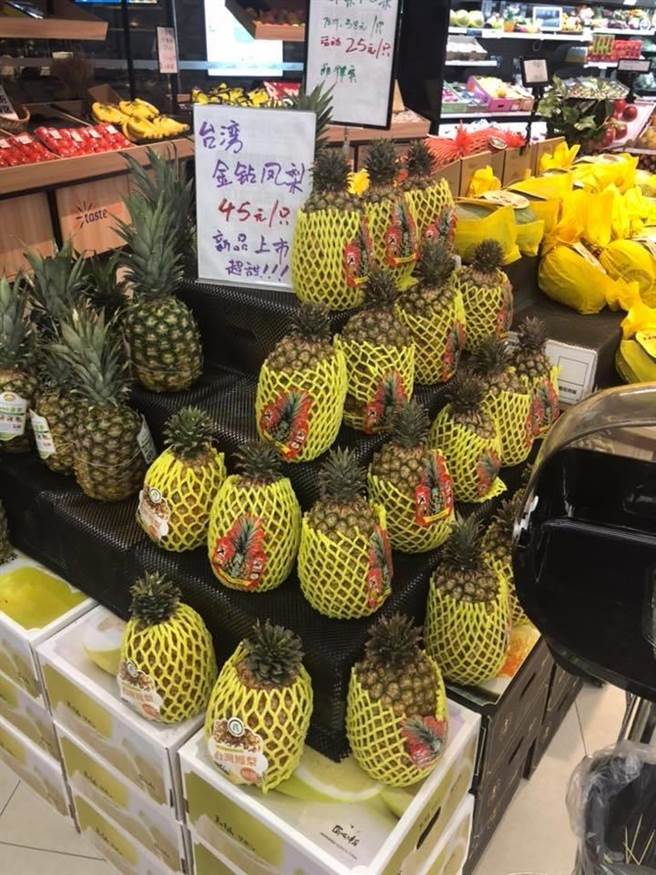 據報道,近日有位網友周先生在臉書韓國瑜後援會上分享一張圖,畫面是上海一家超市賣場,特別擺出臺灣菠蘿,還寫著“臺灣金鑽菠蘿,一只45元人民幣,新品上市,超甜”。