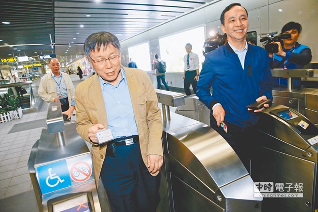 圖為柯文哲(左)、朱立倫過去宣傳捷運月票。(圖片來源:臺灣《中國時報》)