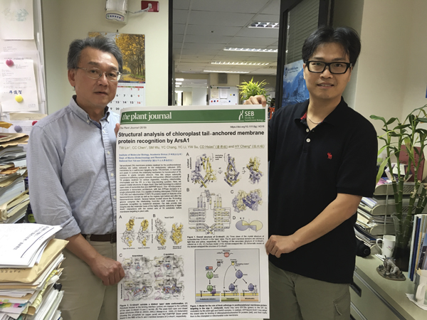 臺灣中山大學海洋生物科技暨資源學係助理教授張欣旸(右)研究團隊,與臺灣“中央研究院”分子生物學研究所研究員蕭傳鐙團隊合作,創全球先例,首度破解尾端膜蛋白是如何準確地被送到葉綠體外膜之謎,讓綠藻的光合作用執行更有效率。(圖片來源:臺灣“東森新聞雲”)