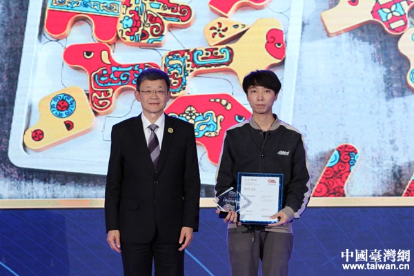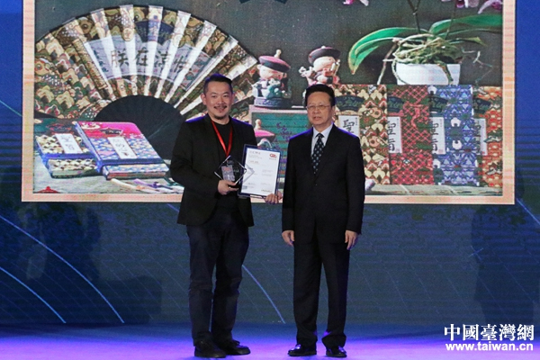 國務院臺辦交流局局長黃文濤(左)為第二屆中華設計獎概念組金獎《十二生肖拼版積木》頒獎。(中國臺灣網 李奕均 攝)