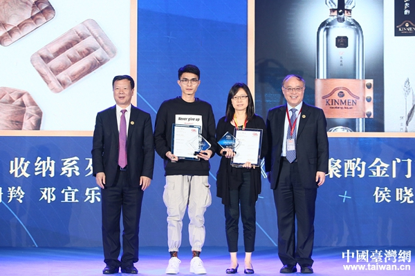 九州文化傳播中心主任王明鑒(右一)和寧波市政協副主席、黨組副書記鬱偉年(左一)為《浯島聚酌·金門高粱酒 58度》和《蠡園借景·收納係列》頒獎。(中國臺灣網發黃友平攝)