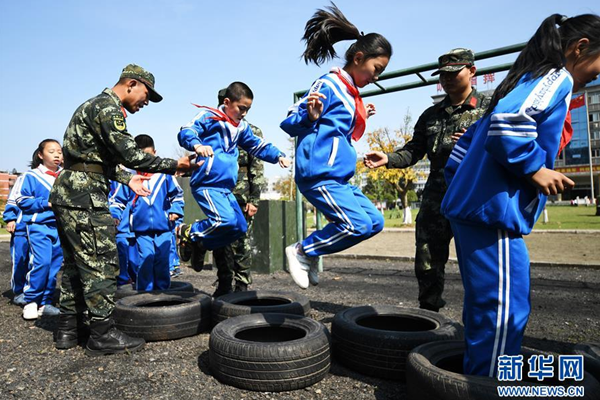 4月12日,學生在活動現場體驗障礙訓練。 在第四個“全民國家安全教育日”來臨之際,重慶市九龍坡區白市驛鎮第二小學的300余名學生走進武警重慶總隊執勤第一支隊機動大隊參觀體驗,近距離感受軍旅生活,接受國防教育。 新華社記者 王全超 攝