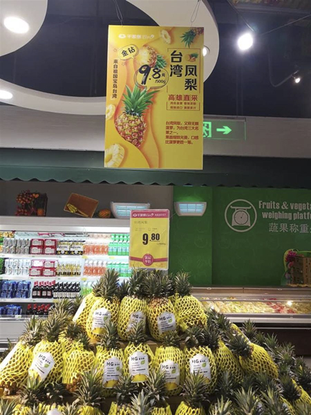 吳芳銘還發布多張照片,稱這些高雄直送的金鑽菠蘿,已在大陸華東地區江蘇的南通、海門、啟東、如東、通州、如皋和上海等七個城市的文峰千家惠超市上架,深受好評,持續熱銷。