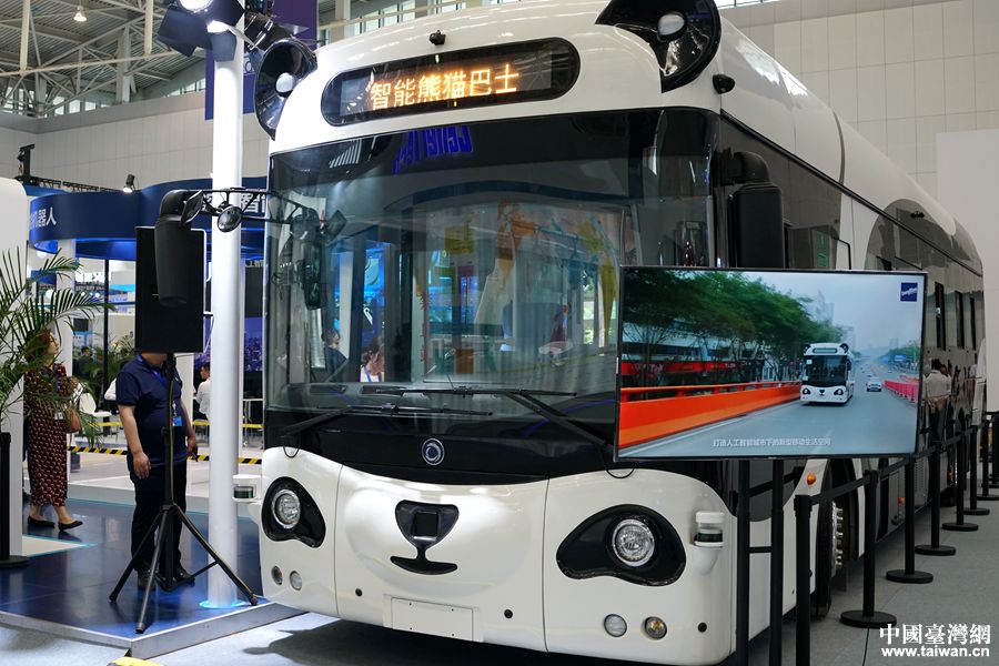 熊貓智能公交車,匯集智能駕駛係統、語音交互係統、智能無人零售係統、車載機器人、精準廣告推送係統、手脈識別係統、智能逃生緊急處理係統、乘客異常行為監控係統等功能。(中國臺灣網 黃曉迪 攝)