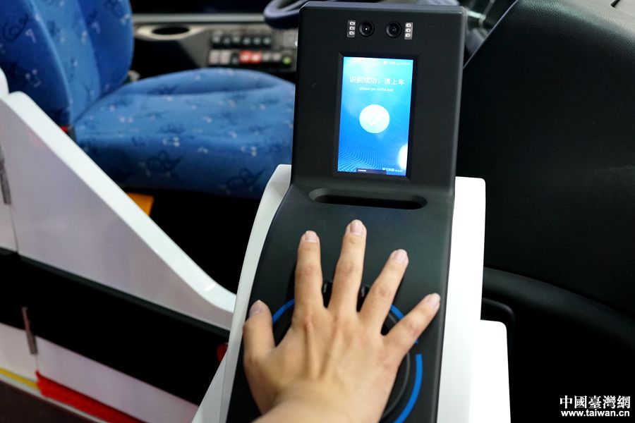 登上熊貓智能公交車,通過手脈識別係統“刷手”乘車。(中國臺灣網 黃曉迪 攝)