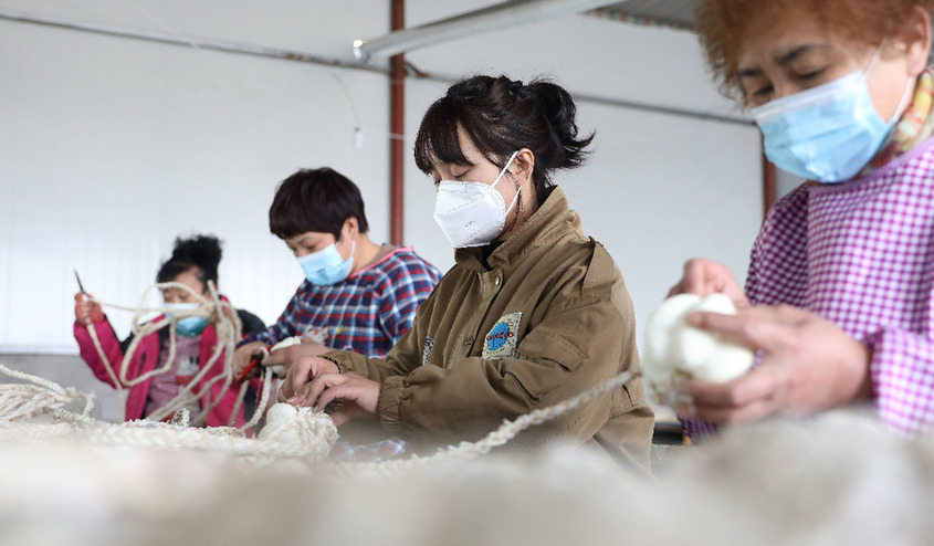 3月4日,閆佳欣(右二)在工廠車間內和女性村民們一起制作手工藝品。新華社記者 姚劍鋒 攝