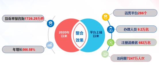 隨著熱線平臺的整合優化,2020年,全國市場監管部門通過12315熱線及平臺接收的公眾訴求大幅增加,全國12315平臺訪問量達7247萬人次,累計注冊公眾用戶682萬人,全國市場監管部門依托12315平臺共處理投訴舉報咨詢1726.29萬件(受統計范圍擴大、業務板塊增加的影響,數量明顯高于往年),投訴舉報處理時長縮短5.35天。整合後新增的產品質量、食品安全、價格、藥品等業務,佔投訴舉報總量的33.51%。通過整合建設12315熱線及平臺,有力促進了市場監管部門各項業務融合,重構了投訴舉報處理模式,推進了市場監管投訴舉報業務的整體運轉、程序統一、銜接順暢和高效處置,為消費者維護自身合法權益提供了更多便利。