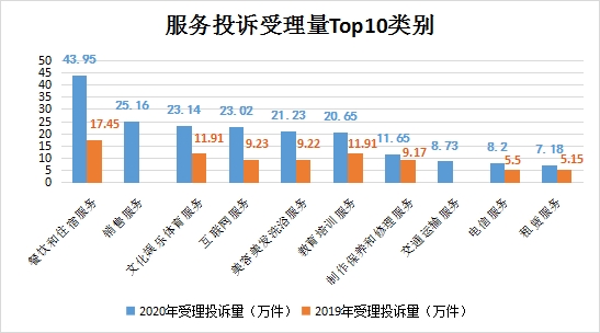服務投訴排名靠前的是:餐飲和住宿服務43.95萬件,銷售服務25.16萬件,文化娛樂體育服務23.14萬件,互聯網服務23.02萬件,美容美發洗浴服務21.23萬件。