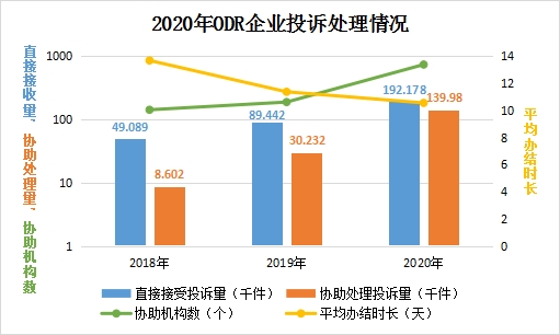 2020年,市場監管部門大力推進在線糾紛和解機制建設,努力把消費糾紛化解在源頭、解決在基層、和解在企業。全國12315平臺共發展ODR企業2.55萬家,主動與消費者協商糾紛19.22萬件,與傳統調解方式相比,和解率高出6.21個百分點,平均處理時長縮短7.76天,消費者滿意度4.07分(滿分5分),ODR城市覆蓋率由25.60%增加到91.11%。與2019年相比,2020年ODR機制運行質量有了明顯提高,投訴處理量、辦理效率、和解成功率、消費者滿意度等各方面均有明顯提升,維權效能日益突顯。