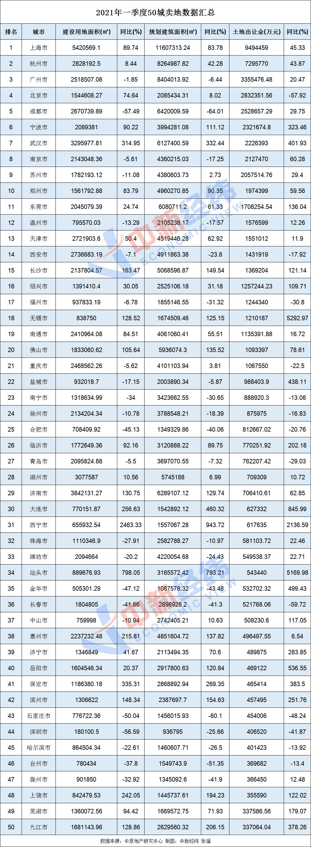 具體來看,50城中,一季度,上海賣地超900億,收入最多;杭州緊隨其後,賣地超700億;廣州賣地超300億,居第三名。在賣地收入增速方面,無錫增速最快,同比增長5292.97%。