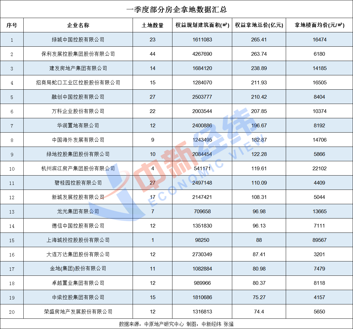 房企拿地方面,中原地產研究中心統計數據顯示,一季度,有12家房企拿地超百億。