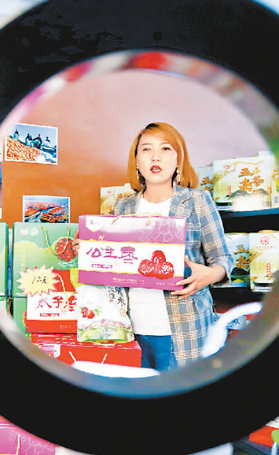 一名直播銷售員在金張掖文旅農牧特產館直播間為臨澤紅棗帶貨。