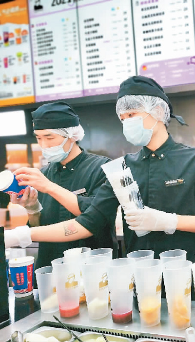 4月6日,在北京市朝陽區合生匯的一家奶茶店,調飲師在為顧客準備奶茶。
