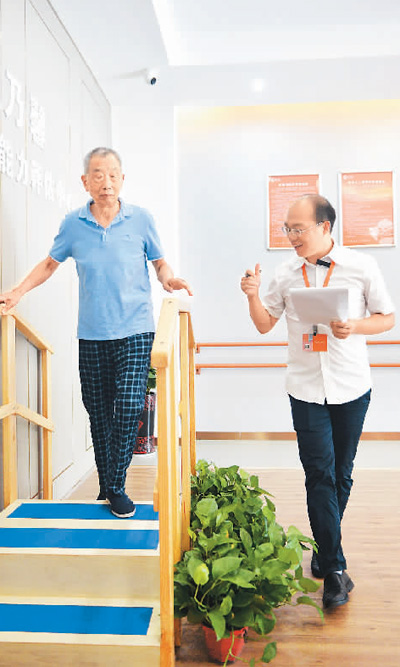 在湖南長沙康乃馨老年呵護中心,老年人能力評估師王帝權(右)為一名老人做生活自理能力評估。