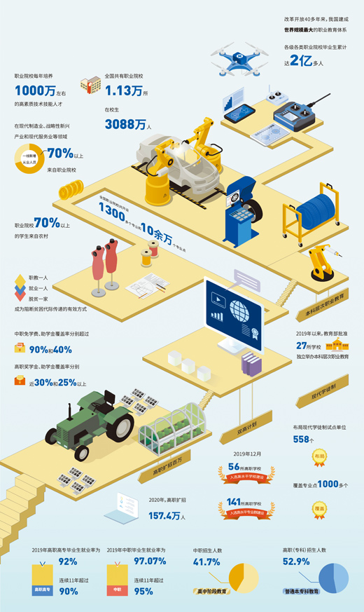 目前,我國已建成世界規模最大的職業教育體係。“職教20條”發布,明確職業教育與普通教育是兩種不同教育類型,具有同等重要地位。職業教育在培養技能人才、服務就業民生、助推產業升級、助力鄉村振興等方面日益發揮著重要作用。