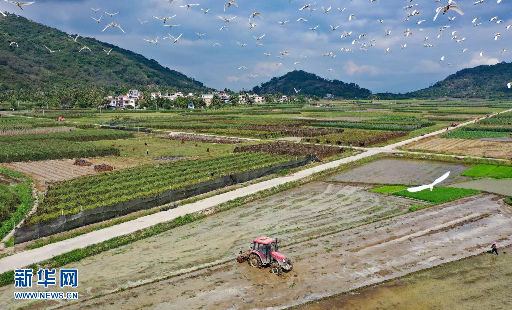 海南省陵水黎族自治縣光坡鎮的農民在田間勞作(4月5日攝,無人機照片)。 新華社記者 郭程 攝
