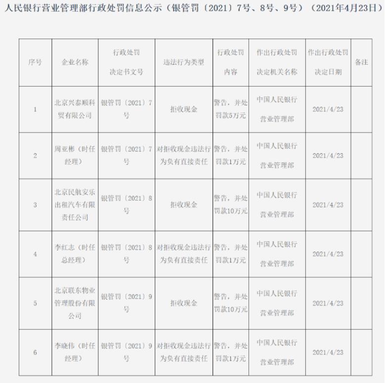 4月23日,中國人民銀行營業管理部一口氣開出6張罰單,均與拒收現金有關!