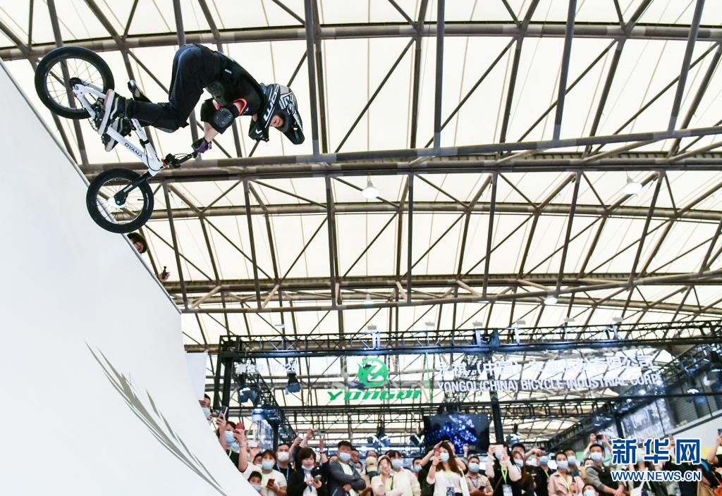 在上海舉行的第30屆中國國際自行車展覽會上,一名小騎手為觀眾表演車技(5月5日攝)。新華社記者 李賀 攝