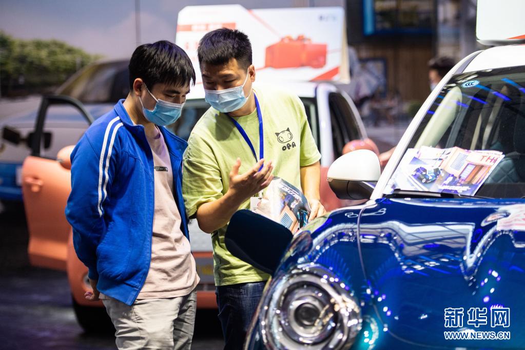 在湖南省長沙市舉行的2021湖南汽車展覽會暨長沙市汽車消費節上,工作人員(右)向觀眾介紹展車(5月1日攝)。新華社記者 陳思汗 攝