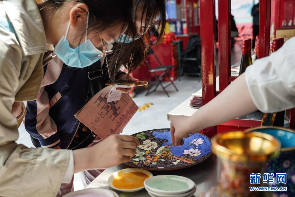 在北京前門大街舉行的“前門國潮京品節”上,遊客在體驗景泰藍的點藍技藝(5月2日攝)。新華社記者 彭子洋 攝