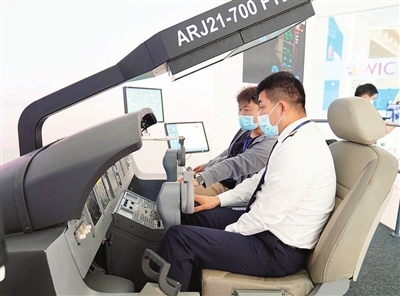 昨天,在記者探營智能科技展時,大廳內的一臺飛行訓練器頗有人氣。這是國家級高新技術企業天津華翼藍天科技股份有限公司帶來的展品,記者也忍不住坐進半封閉式的“駕駛艙”模擬飛行體驗。