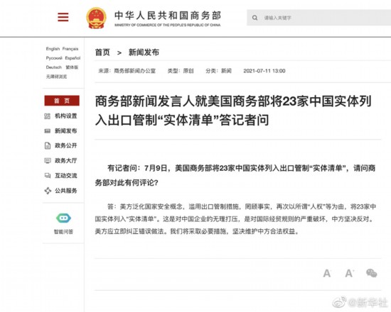 據商務部網站7月11日消息,針對美國商務部近日將23家中國實體列入出口管制“實體清單”,商務部新聞發言人11日答記者問表示,美方泛化國家安全概念,濫用出口管制措施,罔顧事實,再次以所謂“人權”等為由,將23家中國實體列入“實體清單”。這是對中國企業的無理打壓,是對國際經貿規則的嚴重破壞,中方堅決反對。美方應立即糾正錯誤做法。我們將採取必要措施,堅決維護中方合法權益。(記者于佳欣)