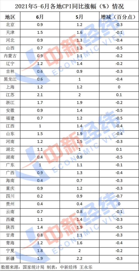 31省份6月CPI出爐:27地漲幅回落 四川降幅最大