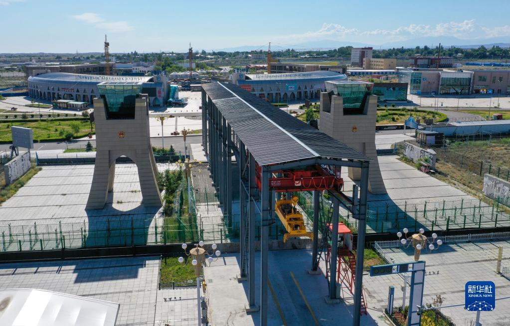 這是6月15日在新疆中哈霍爾果斯國際邊境合作中心拍攝的“空中陸橋”(無人機照片)。新華社記者 丁磊 攝