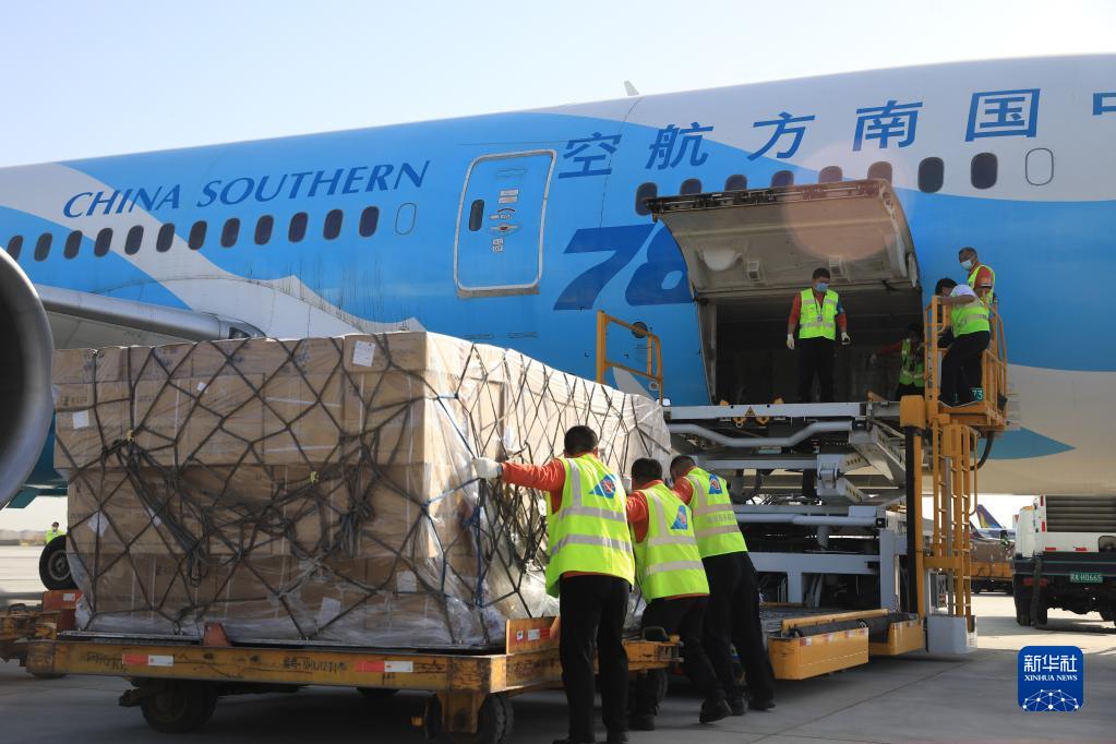 在烏魯木齊國際機場,南航工作人員為飛往維也納的客改貨航班裝貨(2020年4月27日攝)。新華社發(張思維 攝)