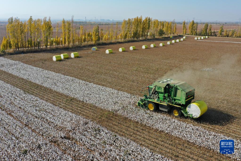 在新疆瑪納斯縣樂土驛鎮文家莊村,一臺採棉機在棉田里採收棉花(2020年10月17日攝,無人機照片)。新華社記者 丁磊 攝
