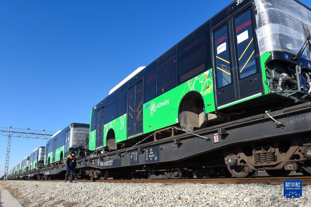 在新疆霍爾果斯鐵路口岸,調車人員在檢查中歐班列,列車上裝載著即將出口的公交車(2月6日攝)。新華社記者 丁磊 攝