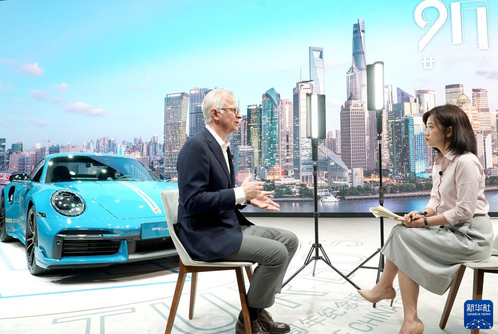 4月19日,保時捷高管在第十九屆上海國際汽車工業展覽會上接受採訪。新華社記者 陳建力 攝