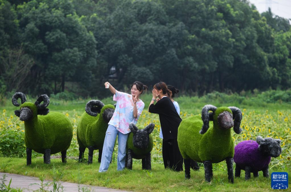8月10日,幾名遊客在浙江湖州東林鎮南山村特色度假小鎮的向日葵花田旁自拍留影。新華社記者 徐昱 攝